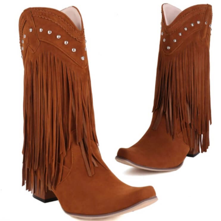 L’association de bouts pointus, de rivets métalliques et de franges élégantes donne à ces bottes une personnalité unique.