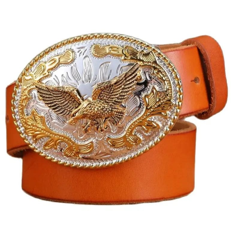 Ce chef-d’œuvre de ceinture de cowboy comprend une sangle en cuir pleine fleur et une boucle ovale ornée d’un magnifique aigle doré. Grâce à son système novateur à vis, changer la boucle devient un jeu d’enfant et prend moins d’une minute.