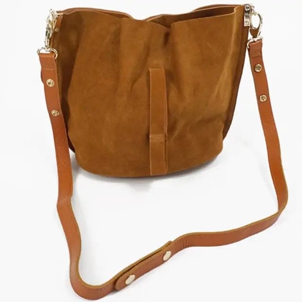 Fabriqué en daim, ce sac seau offre un espace de rangement généreux pour transporter : livres, téléphones, portefeuilles et toutes les affaires essentielles de la journée.